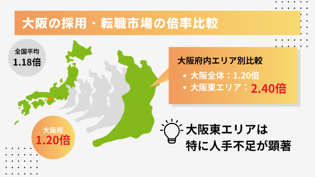 ただし、エリアや職種によって状況は大きく変わります。例えば、大阪東エリアは2.4倍と高い数値を示し、人手不足が顕著な地域もあります。