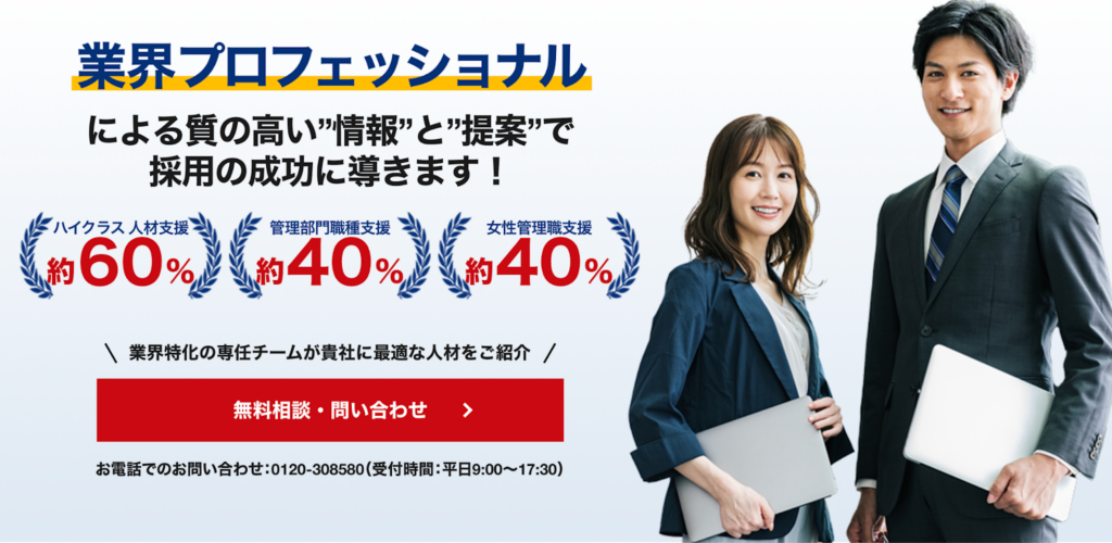 また、女性向けの専門チーム「Women’s Career Success」があり、女性管理職の採用に強いサポートを提供しています。ハイクラス採用を強化したい企業に適した人材紹介会社です。
