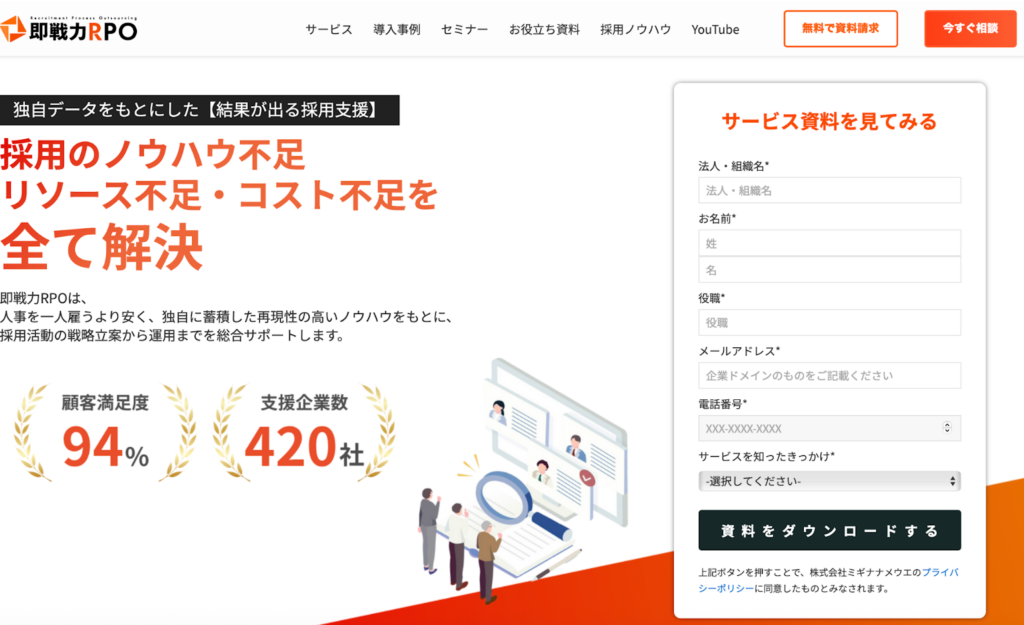 特徴・面接以外の採用業務を一括代行・スカウト・広報・戦略設計・選考管理まで総合支援・420社以上支援・満足度94%超の高品質RPO