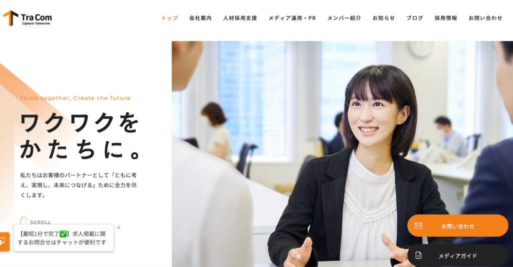 トラコム株式会社は、採用代行にとどまらず採用・人材育成・集客」まで一気通貫で支援できる点が特徴です。採用活動に必要な工程をすべて任せられるため、社内リソースが限られているベンチャー企業に適しています。